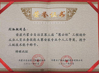 我司闫淑敏获得《完美电竞(中国)官方网站自治区第三届“慧云杯”工程造价从业人员业务技能大赛》个…